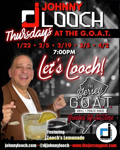 Johnny Looch is back at The Jersey G.O.A.T. bringing the vibes every Thursday night. Good music, cold drinks, and Looch’s Lemonade flowing all night. Pull up at 7 PM on 1/22, 2/5, 2/19, 3/5, and 4/2 and make it a Thursday tradition!